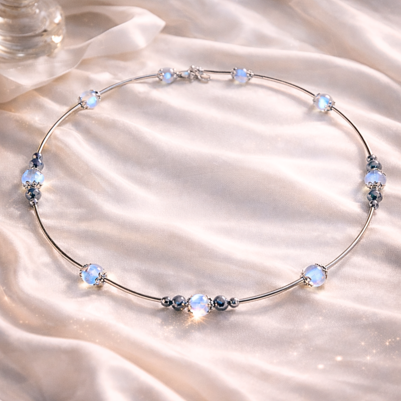 See õrn ja elegantne kaelavõru ühendab endas kahe erilise kivimi harmoonia – helendava Kuukivi ja sügavalt maandava Hematiidi. Hõbedaste detailidega raamitud kivid loovad puhta ja ajatu ehte, mis sobib nii igapäevaseks kandmiseks kui ka erilisteks hetkedeks.