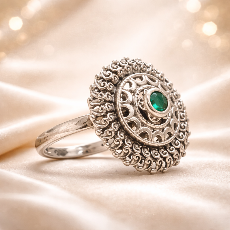 Õrnalt mustriline hõbe raamib kivi nagu kaitsev ring, hoides ja toetades.
