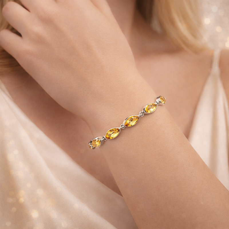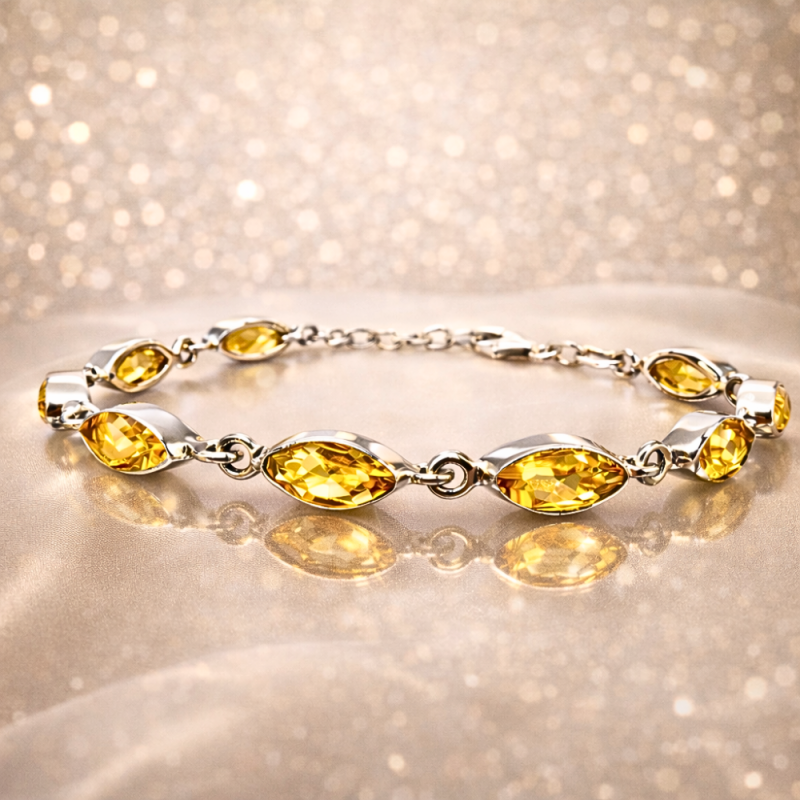Käeketis säravad hoolikalt valitud kollaka tooniga tsitriinikivid, mis on raamitud kvaliteetsesse hõbedasse, tuues esile nii kivi loomuliku sära kui ka metalli puhta ilu. Õrn, kuid pilkupüüdev disain sobib kandmiseks nii igapäevaselt kui ka erilistel hetkedel.